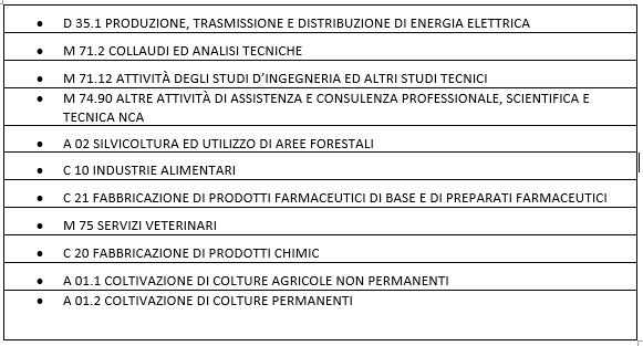Le principali attività economiche prese a riferimento per l’elaborazione della presente scheda sono state quelle della produzione, trasmissione dell’energia elettrica, gli studi di ingegneria, le industrie agricole e/o industriali che hanno implementato impianti ad energia alternativa o che producono combustibili non di origine fossile e le imprese e tecnici che operano per la costruzione e la realizzazione di tali impianti. In particolare le attività sono riconducibili ai seguenti codici NACE: